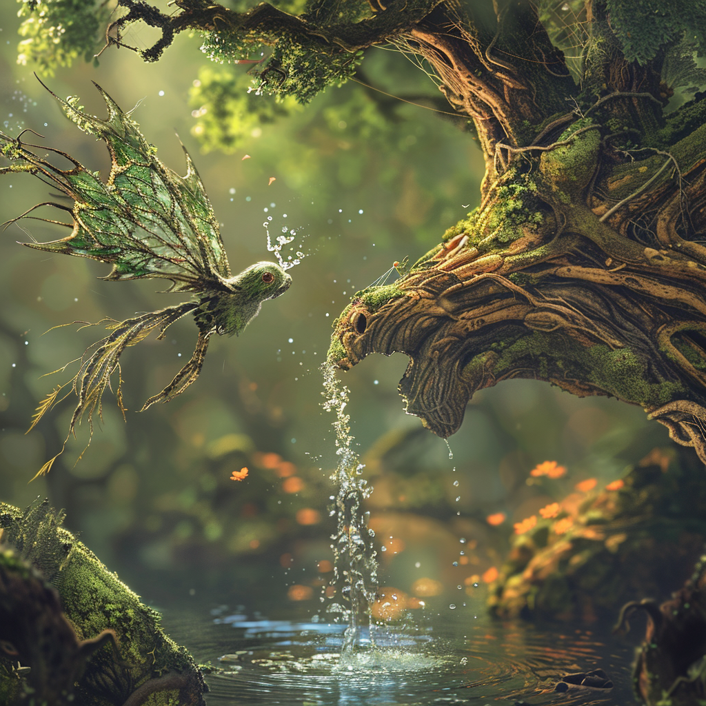 Moving through the jungle of Kohkiri Forest, I noted many types of flora I have never seen before. Studying a large bird that looked like it had leaves for wings drinking, what looked like, water coming from a tree branch. Stopping, I took out an empty vial and rinsed it, filling it with the water to inspect it later.